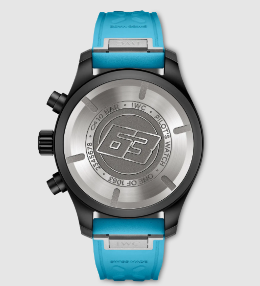 スポーティで洗練されたこのクロノグラフは、ブラックの酸化ジルコニウム・セラミック製ケースに、セラタニウム®製のリューズとプッシュボタンを組み合わせています。ブラックの文字盤には、ジョージ・ラッセルのシグネチャーブルーでプリントと夜光塗料が施され、強い存在感を放ちます。この色は、プレッシャーの中での冷静さと、レースの勝負所で見せる激しい競争心という、ドライバーとしての彼の二面性を表現しています。チタン製のケースバックには、ラッセルがキャリア初期から使い続けているカーナンバー「63」が刻印されています。