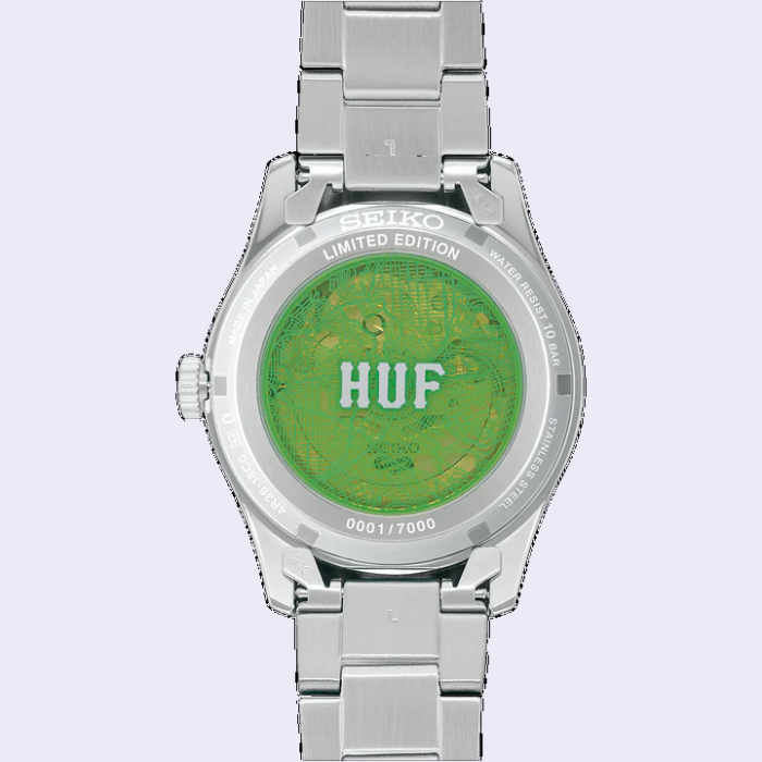 1970年代のセイコーのアーカイブモデル「タイムソナー」に着想を得ており、HUFグリーンの半透明ダイヤルが特徴です。ダイヤルの6時位置にはHUFのロゴが配置されています。キャリバー4R36搭載、パワーリザーブは約41時間です。世界限定7,000本で販売されており、シースルーの裏蓋にはシリアルナンバーとサンフランシスコをイメージしたグラフィックが刻印されています。