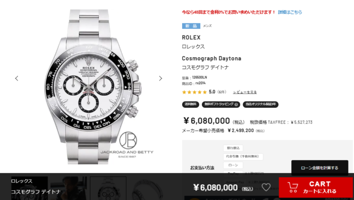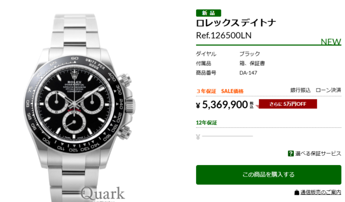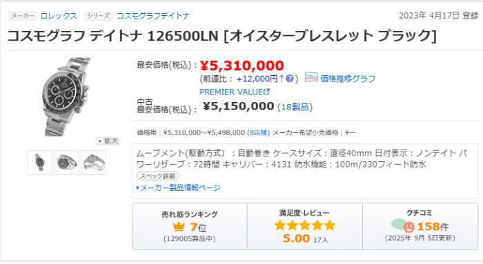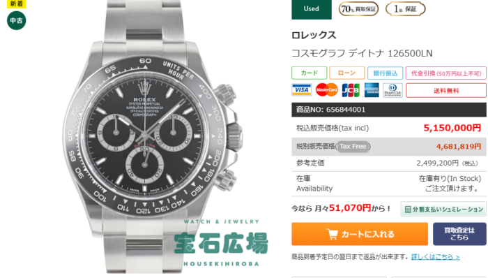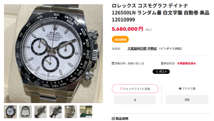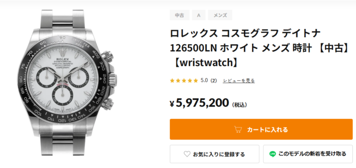 黒文字盤は500万円台前半、白文字盤はついに600万円の壁を突破。国内定価2,499,200円に対していずれも倍以上という異常とも言える水準ですが、それでも流通は止まりません。正規店での入手難易度を考えれば、プレミアムは「市場の評価」とも言えるでしょう。