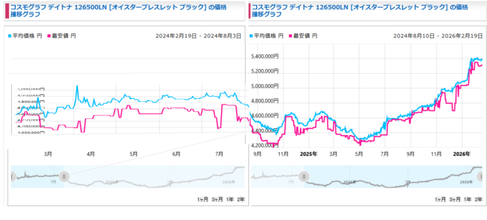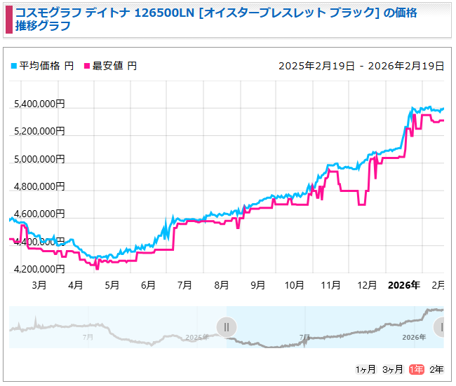 この数か月での再上昇は、金価格の高騰、為替、世界的な高級時計需要の底堅さなど複数の要因が絡み合っています。ステンレスモデルでここまでの水準を維持できるブランド力は、やはりRolexならでは。デイトナという特別なアイコンの強さを改めて感じます。