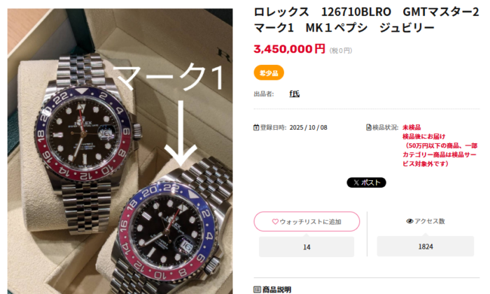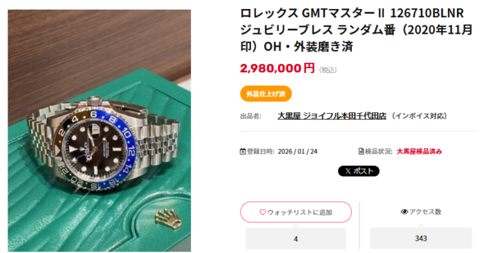 新品未使用品掲載はトキオカさん。335万円。ベゼルが違うだけで70万円もの差があります。