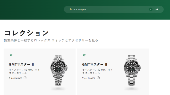 因みにブルース・ウェインはバットマンの中の人で126710GRNRのニックネーム。ロレックスのホームページで「bruce wayne」と検索すればヒットします。もちろん「pepsi」「batman」もヒットします。