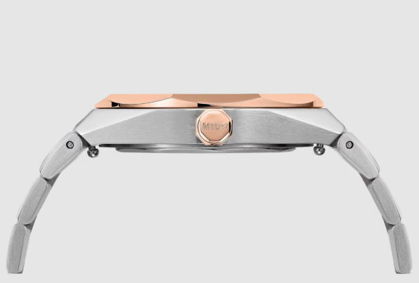 クリーンなライン、バランスの取れた40mmケース、そして特徴的な八角形のベゼルを備えたマルチフォート 8 ワン クラウンは、大胆で現代的なデザインを体現しています。水平方向の溝が織りなす文字盤は、リズムと奥行きを表現し、スーパールミノバ®が完璧な視認性を確保します。両面反射防止加工のサファイアクリスタルが文字盤を保護し、ポリッシュ仕上げのエッジを持つサテン仕上げのスティールケースが、その美しさをさらに引き立てています。シースルーケースバックから眺められる、長時間駆動を実現するスイス製自動巻きムーブメント、キャリバー80を搭載したこのタイムピースは、ミドーのテクノメトリービジョン、すなわちテクノロジーと幾何学的形状の調和のとれた融合を反映しています。堅牢性、精度、そしてスタイリッシュなマルチフォート 8 ワン クラウンは、個性と卓越性を求める人々のために作られています。