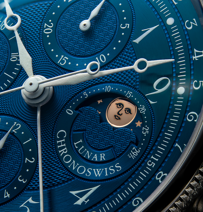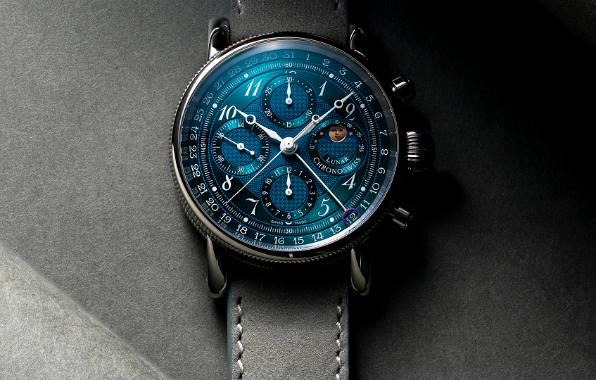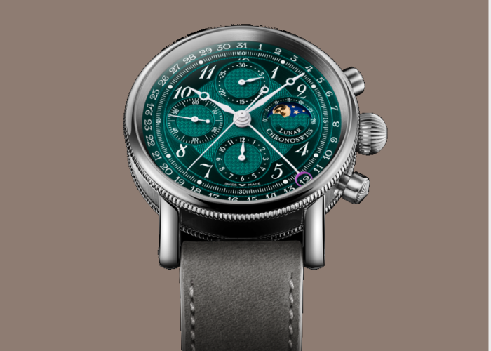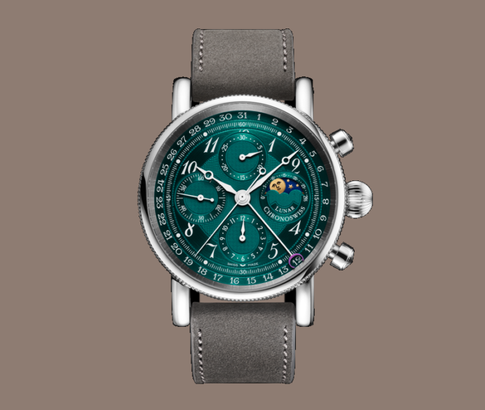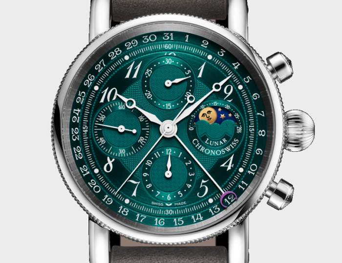 クロノスイス「ルナ・クロノグラフ」のムーンフェイズ表示は、月の周期的な動きをクラシックな表現で描き、技術的な精巧さと感性的な美しさを融合させています。精緻に作り込まれた文字盤に調和して組み込まれ、その姿は自然の時間のリズムを象徴しています—正確で、時代を超えた美しさを持ち、個性に満ちています。