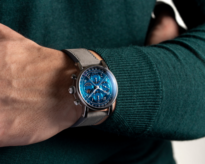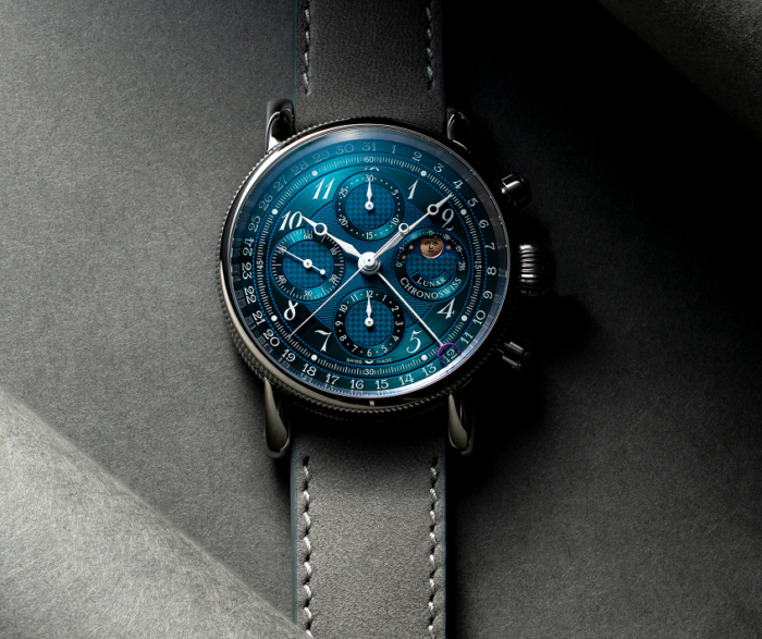 ルナクロノグラフ オーロラは、クロノスイスの最も不朽の名作複雑機構の一つを現代に蘇らせます。全面CVDコーティングを施した文字盤は、深みのあるグリーンから鮮やかなブルーへと変化し、オリジナルの独特な構造を保ちつつ、新たな深みを加えています。クロノグラフのセンターセコンドに加え、30分積算計と12時間積算計、アナログ日付表示、そして3時位置に洗練されたムーンフェイズを備えています。シグネチャーのオニオンリューズに縁取られ、グレーのヌバックストラップと組み合わせられたオーロラは、伝統と現代的な表現を自信に満ちたバランスで表現しています。