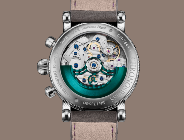 クロノスイスの自動巻きキャリバーC.755は、ETA7750をベースにしたムーブメントでパワーリザーブは約46時間です。