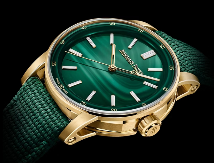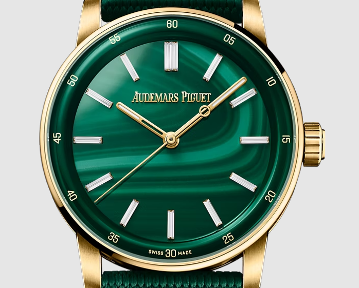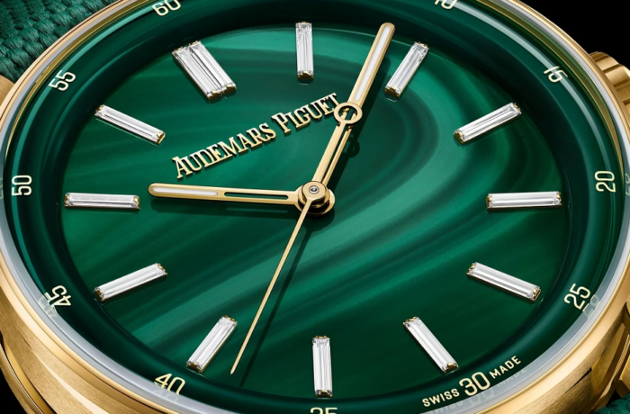 天然グリーンマラカイトのストーンダイヤル、蓄光加工を施した18Kイエローゴールドの時針と分針、13個のバゲットカットダイヤモンドのアワーマーカー(トータル約 0.40ct)、グリーンのインナーベゼル。