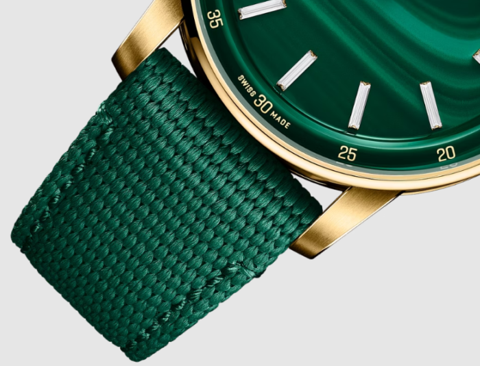 変革、成長、バランスの取れた感情を象徴するとされるマラカイトは、深いグリーンのカラーに渦巻き模様が見え微妙なシェードが魅力的な天然石です。多面カットのイエローゴールドケースとの鮮やかなコントラストを生むグリーンの天然石ダイヤルは、バゲットカットダイヤモンドのアワーマーカーによって引き立てられています。