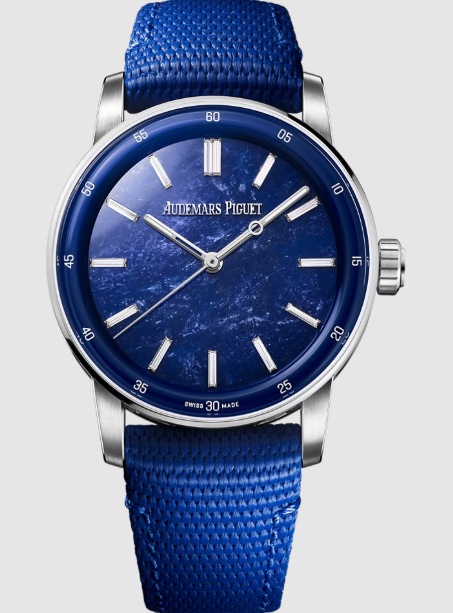 「詩人の石」として知られるソーダライトは創造性、洞察力、芸術表現を象徴するとされ、「CODE 11.59 バイ オーデマ ピゲ」コレクションの表現豊かなデザインを称えるストーンでもあります。天然石ダイヤルに18Kホワイトゴールドケースを組み合わせ、バゲットカットダイヤモンドのアワーマーカーがエレガントなツートーンデザインを引き立てます。