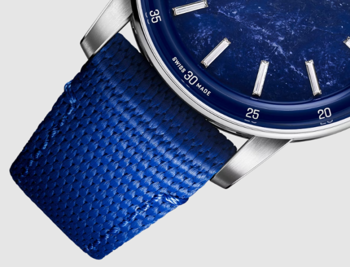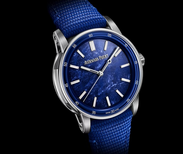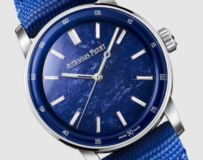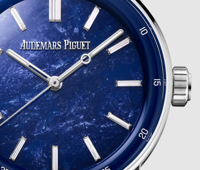天然ソーダライトのストーンダイヤル、蓄光加工を施した18Kホワイトゴールドの時針と分針、13個のバゲットカットダイヤモンドのアワーマーカー(トータル約0.40ct)、ブルーのインナーベゼル。