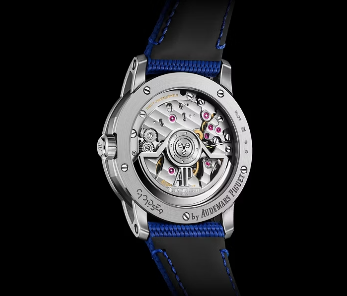 テキスタイル調のブルーのラバーストラップ、18Kホワイトゴールド ピンバックル、ブルーのアリゲーターストラップが付属。