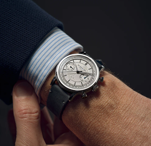 直径37mmのステンレススティールケースにホワイトゴールドベゼルを組み合わせ、往年の手巻きクロノグラフを想起させる端正なプロポーションに仕上げました。